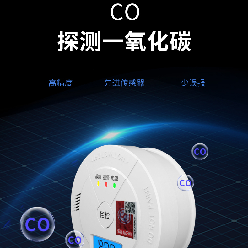 本产品为高稳定性家用可燃气体探测器,用于检测一氧 化碳气体,探测器采用高性能的电化学一氧化碳传感器,具 有稳定性高,功耗低,灵敏度漂移小等特点。符合国标《家用 可燃气体探测器》的技术要求,当探测器检测到有一氧化碳 气体泄漏时,探测器红色 LED 灯闪烁,并发出报警声音。同 时采用背光的 LCD 显示报警浓度。探测器使用 3 节 AA 电池, 同时具有电池防未安装装置。
